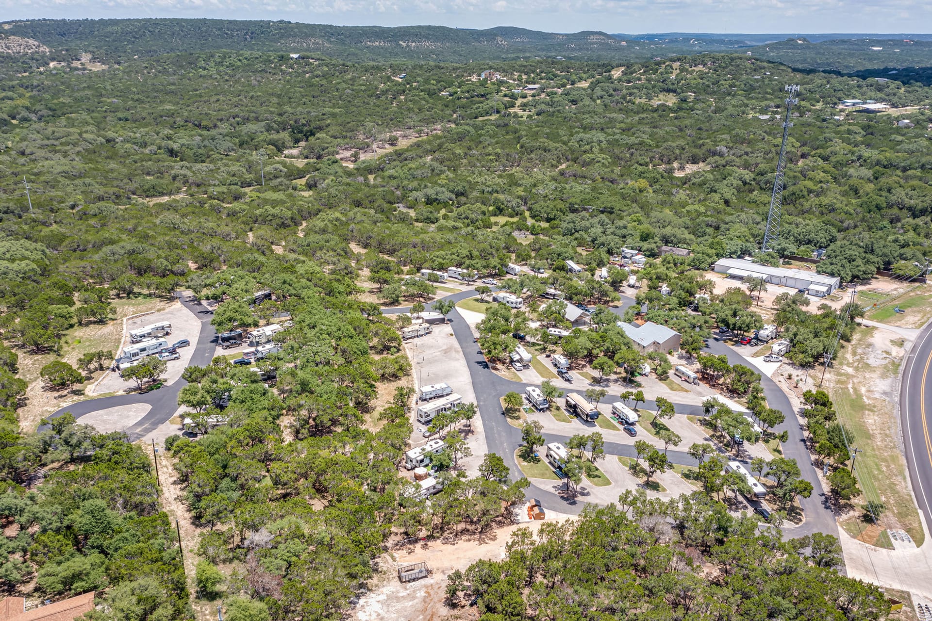 Spacious RV sites with 30/50 AMP full hookups, modern bathhouses, and easy access to Canyon Lake, the Guadalupe River, and scenic Hill Country roads.